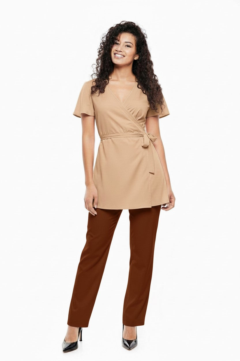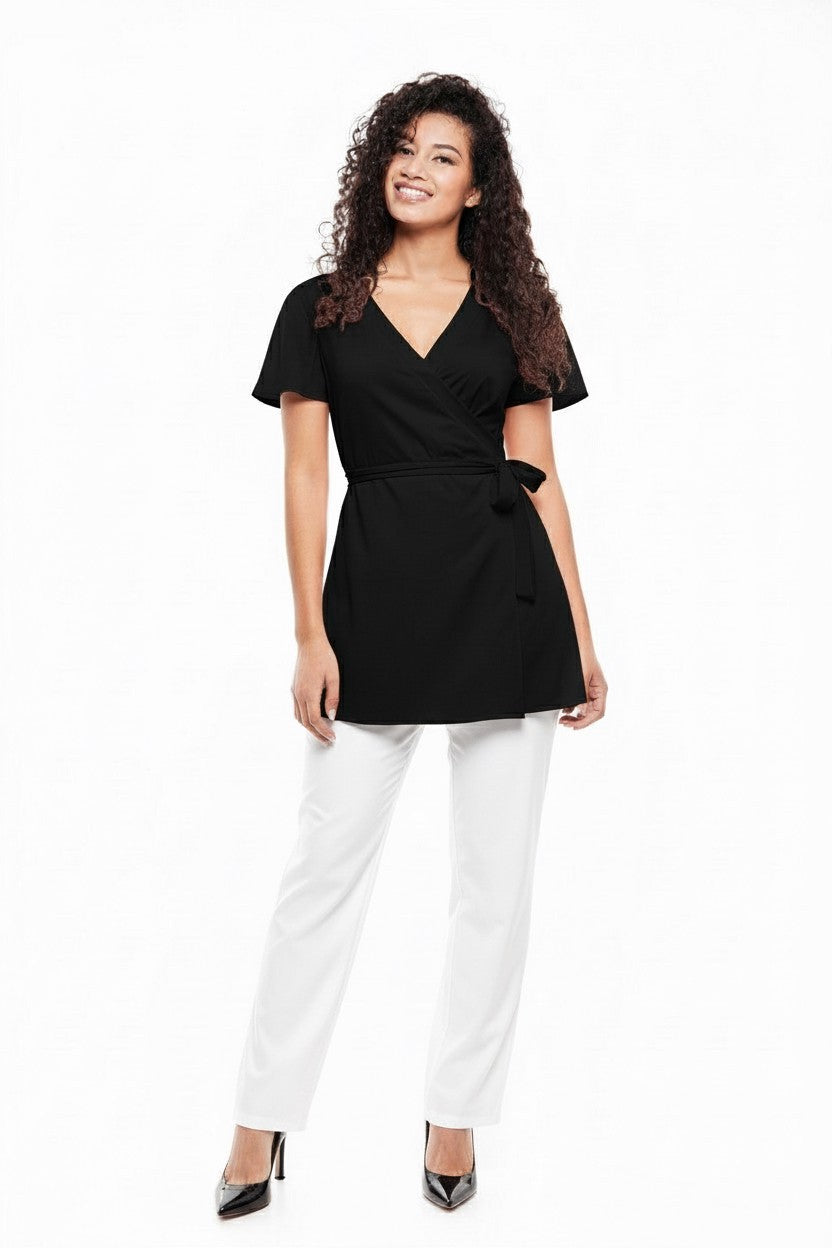 Tunic is wrap around with ties, can be tied at back or side